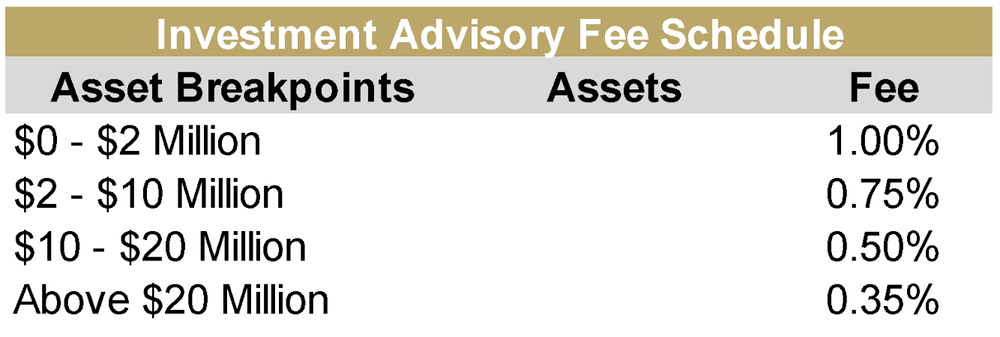 Our fee schedule is listed below. Our managed asset minimum is $1,000,000. Exceptions to the minimum are made at our discretion.