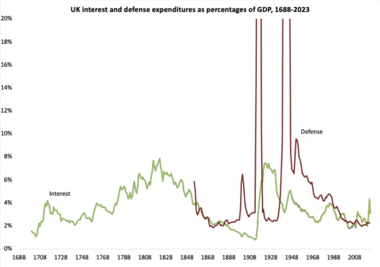 The “Ferguson Limit”: Britain crossed the Ferguson limit (where interest payments exceed defense spending) during three distinct periods: 1857–1861, 1869–1884, and most notably 1920–1937. It crossed again in 2010 following the global financial crisis and subsequent shocks.