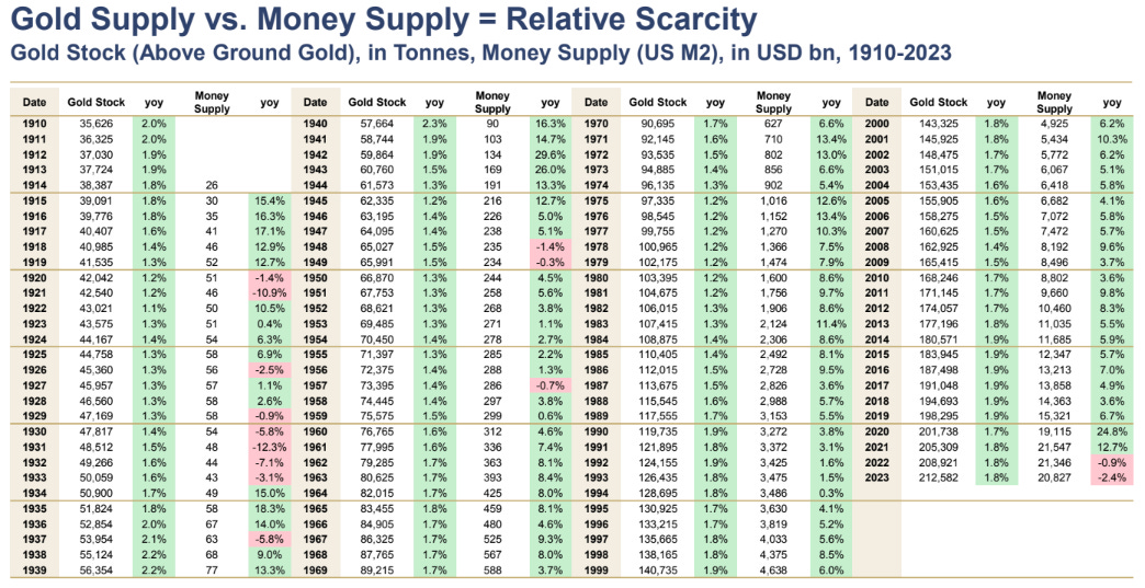 Over the past century, the global supply of gold has increased at an annualized rate of approximately 1.59%, constrained by the geological difficulty of extraction.