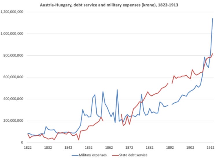 The Ferguson Limit: With the exception of a few brief years (1869–1873, 1878, 1909, and 1913), the Dual Monarchy remained in excess of the Ferguson limit for its entire existence. By the start of World War I, debt service consumed nearly 20% of the imperial budget, while defense spending lagged at just over 15%.