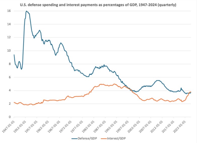 Surpassing the “Ferguson Limit”: In 2024, U.S. net interest outlays reached 3.1% of GDP, exceeding defense spending (3.0%) for the first time in nearly a century.