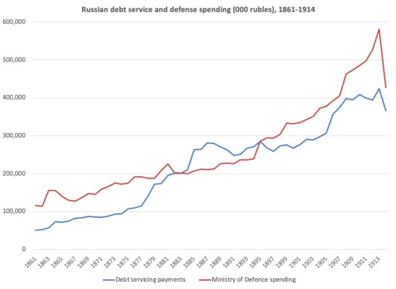 Military Readiness: On the eve of World War I, the Russian Empire was on a sound fiscal footing, with defense spending significantly higher than debt servicing.