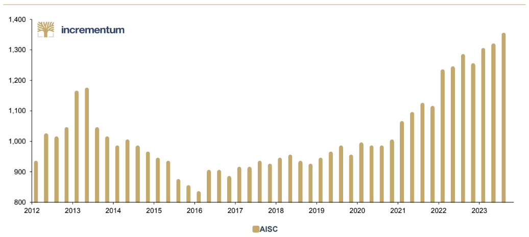 In the chart below, you can see what the All-in Sustaining Cost (AISC) of extracting 1 ounce of gold in USD and how it has increased over time.