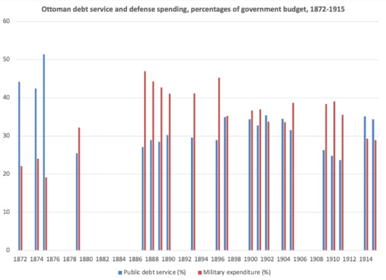 The “Ferguson Limit”: By the 1870s, interest payments on foreign debt consumed more than half of government revenues, far outpacing military expenditures. The empire crossed this limit several times between 1872 and 1915; in 1875, debt service exceeded military spending by a factor of 2.7.