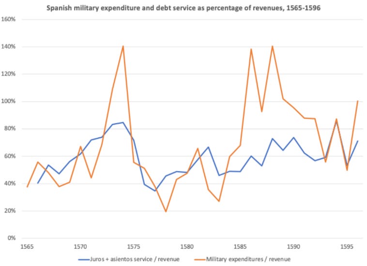 Rising Debt Service Costs: By the late 16th century, interest payments on long-term bonds (juros) consumed over 40% of annual revenues. By 1687, these payments absorbed 87% of Castilian revenues.