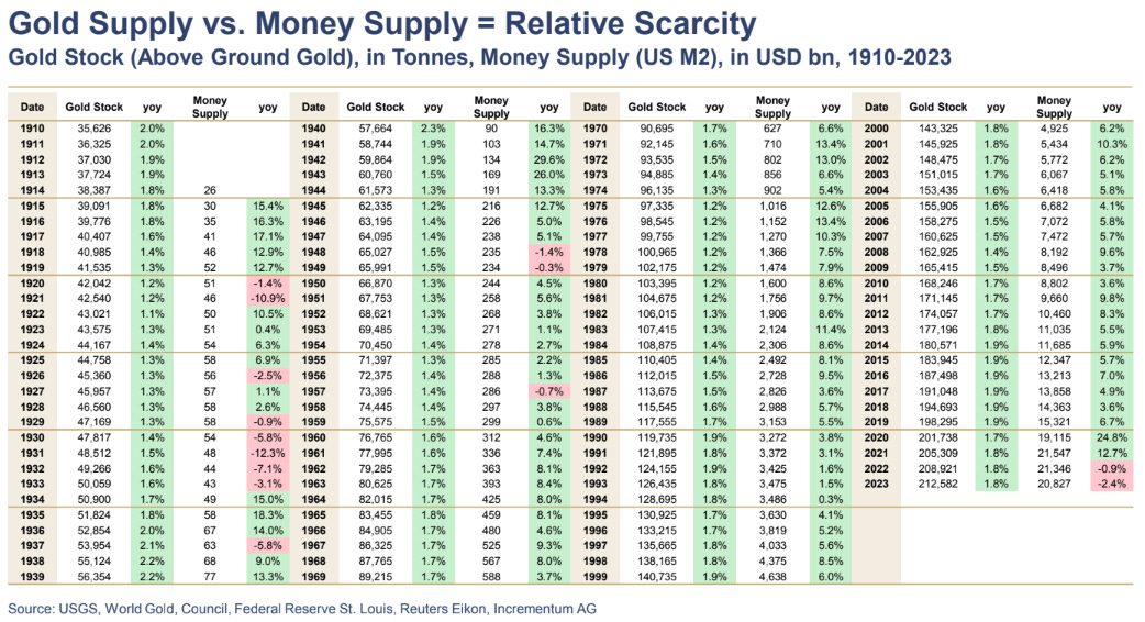 Over the past 109 years, the gold supply has increased from 38,387 tones in 1914 to 212,582 tonnes in 2023 which is an annualized increase of 1.59% per year which favorably compares to the USD supply of 26 billion in 1914 to 212,582 billion in 2023 which is an annualized increase of 8.61%. Thus, the real rate of annualized USD Fiat debasement is closer to the high single digits as opposed to the low single digits so commonly cited by fiat enthusiasts.