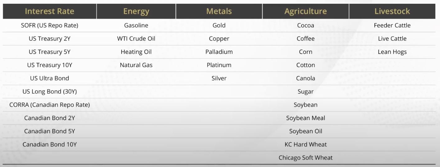 Commodities: Gold, Gasoline, West Texas Crude Oil, Live Cattle, Cattle Feeder, Copper, Corn, Coffee, Cocoa, Silver, Lean Hogs, Platinum, Canola, NY Harbor Heating Oil, Soybeans, and Palladium.