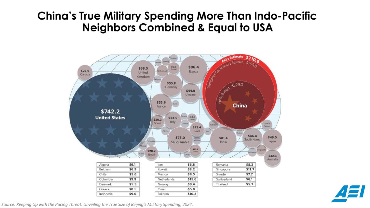 These hidden costs and practices mean China’s military spending is much higher and more efficient than publicly stated, especially when factoring in the lower cost of labor and the concentrated focus of their military efforts on the Asia-Pacific region.