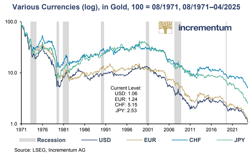 The top global fiat currencies (USD, EUR, GBP, CHF, JPY, etc) have all lost material value relative to gold once they were severed from the gold link in 1971. In fact, the best performing fiat of the Swiss Franc (CHF) “only” lost 93% of its value.