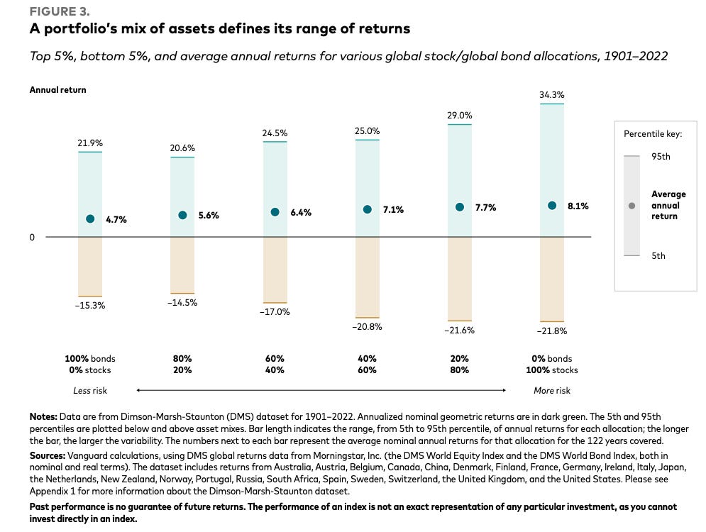 It shows the top 5%, bottom 5%, and the average annual return for various global stock/global bond allocations looking back 120+ years (1901–2022).